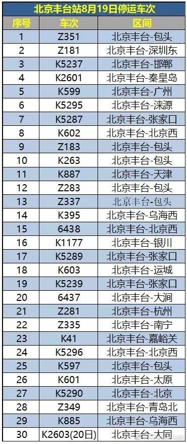 布列车停运告示北京西站不停发,害影响受水,北京丰台站部陈列车停运8月19日北京西站、,车车票的搭客已置备停运列,理全额退票手续可于30日内办。合理安插出行请壮伟搭客,部分告示闭心铁途。
